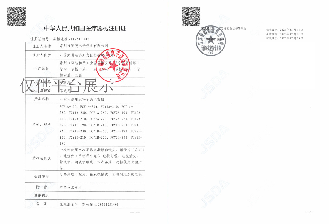 產(chǎn)品名稱 : 延陵一次性使用水冷不沾電凝鑷